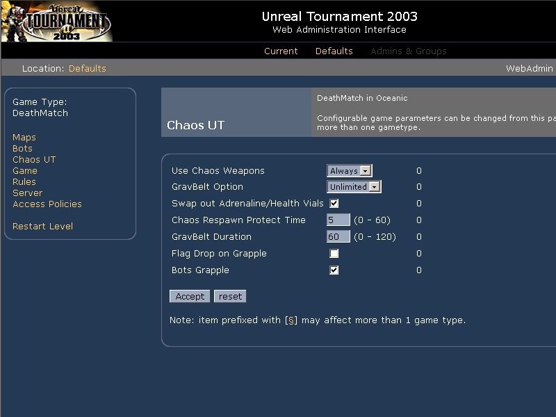 No more digging around in some INI file! ChaosUT2 settings are now available to server admins through UT2003's Remote Web Admin feature.