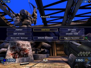 For those who are regular palyers of Chaos, or who would like to have a Chaos background for your UT2003 start menu, we have included the custom ChaosUT2 shortcut.In your UT2003/System folder, you will find another .exe file to start UT2003 with, only this one will be labeled "Play CUT2003". Just click this when you are ready to play (of course you can copy it to your desktop if you wish), and you will have a Chaos background for your main menu.