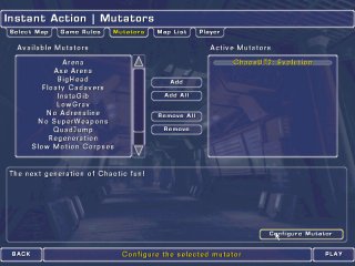 Note: When you click on the ChaosUT2: Evolution mutator, a new 'Configure Mutator' button will appear on bottom right of screen. Clicking on this will open the ChaosUT2 menus. (See configs page)